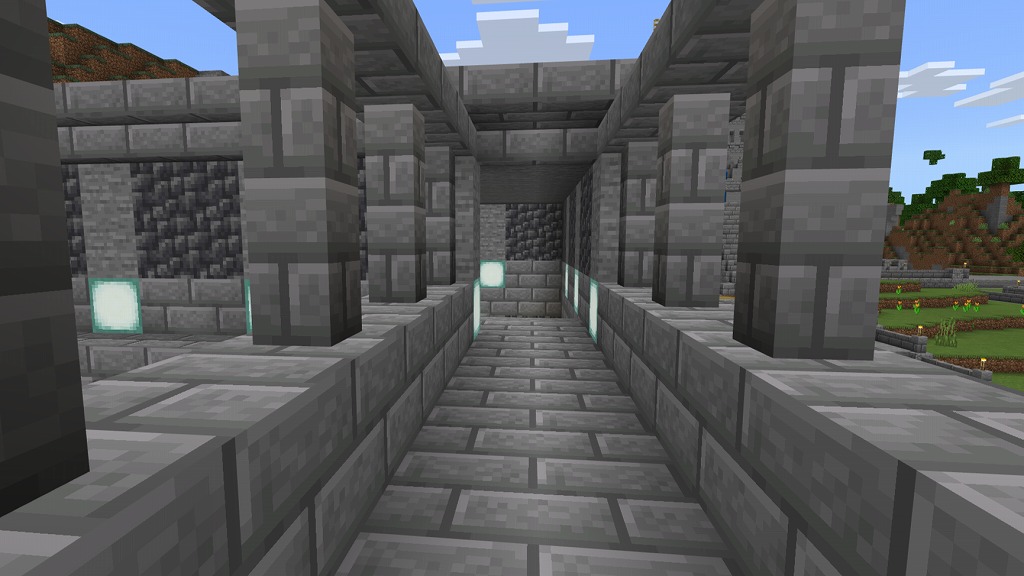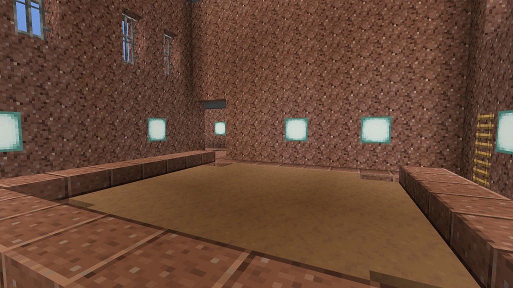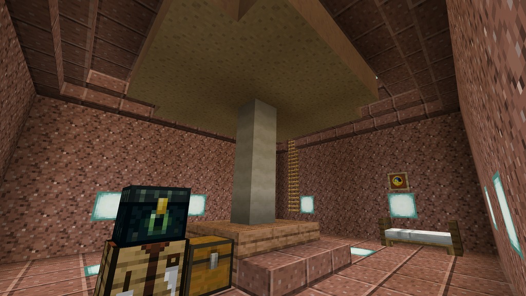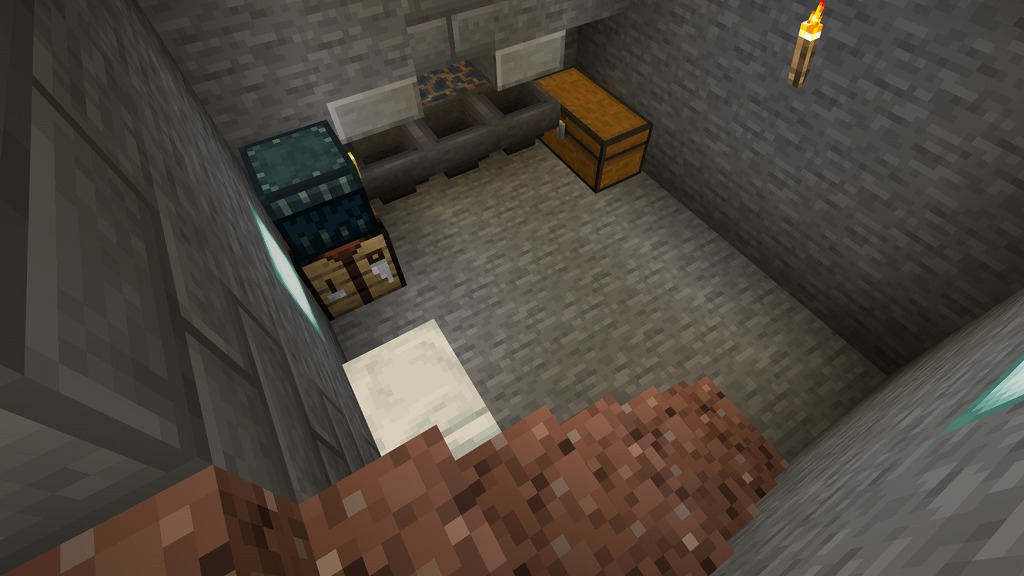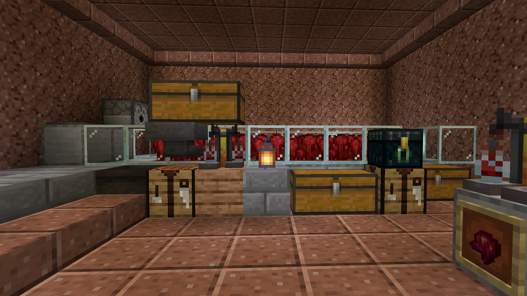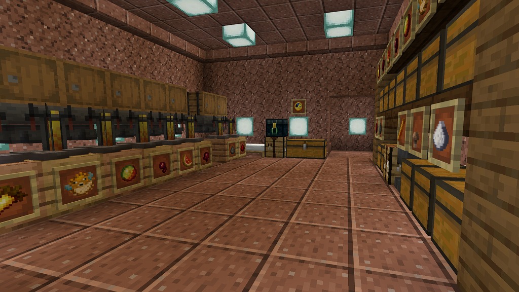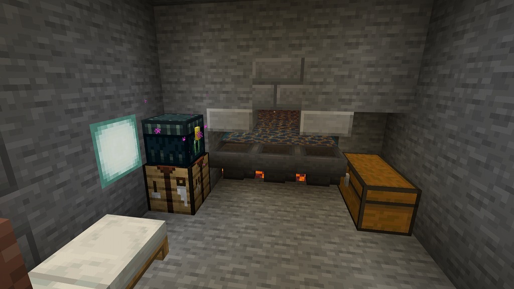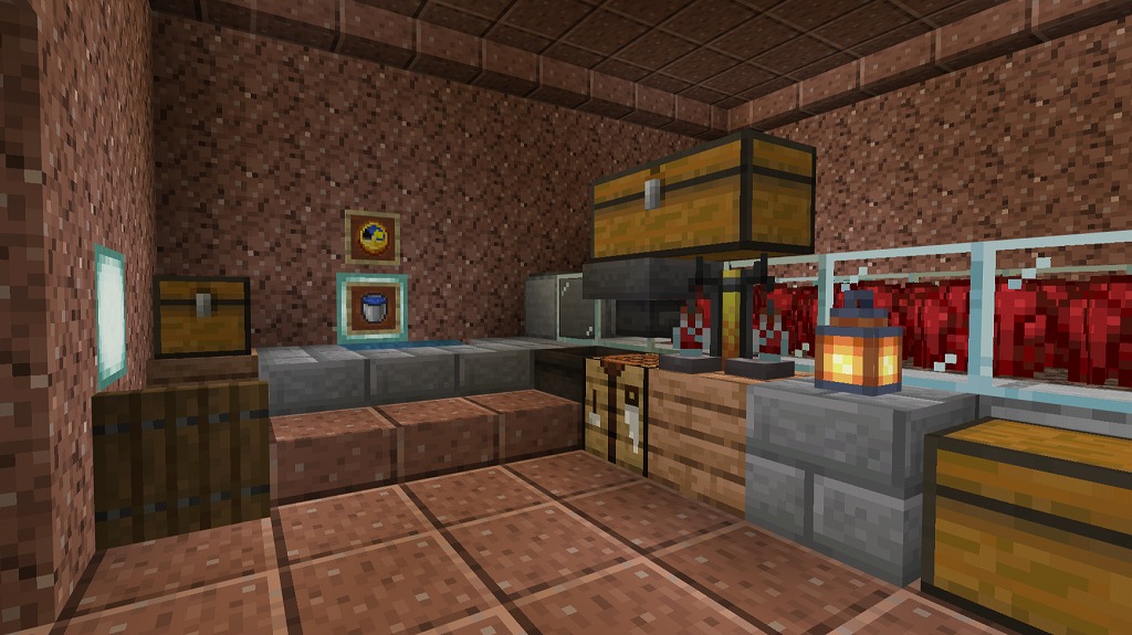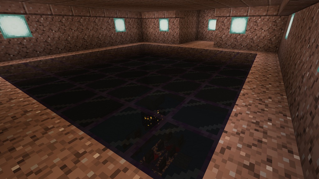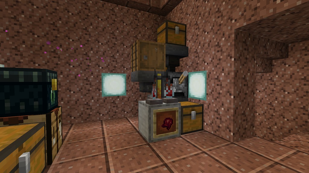 入って正面側奥にネザーウォート畑(水流収穫装置付き)、右手側のガラス製造機(自動かまど)でガラス瓶を確保し、左手側の水源で水を汲んで奇妙なポーションを量産